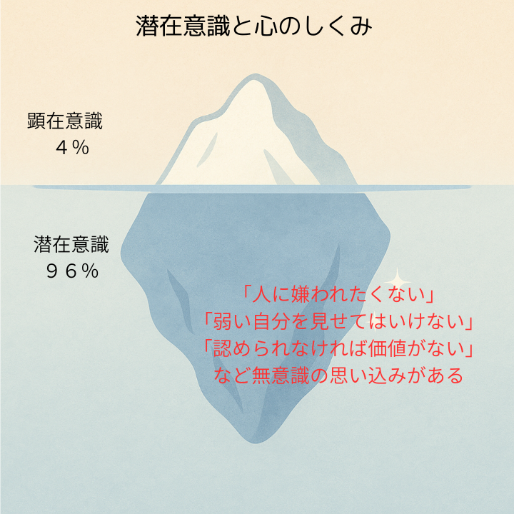 悩みや行動のパターンの多くは、この“潜在意識”にある過去の経験や思い込みによってつくられています。
