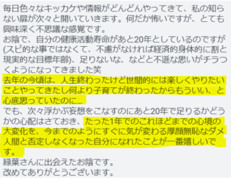 たった1年でのこれほどまでの心境の大変化を今までのようにすぐに気が変わる厚顔無恥なダメ人間と否定しなくなった自分になれたことが一番嬉しいです