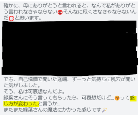 何でも否定的に捉える癖があったのですが、自分の中で生じた思いを全部認めて肯定していき癒されてきた初期段階で鬱のような症状から抜け出すことができました。不登校だった子供もセラピーを始めて3ヶ月経過する頃から少しずつ登校するようになりました。そして半年たったころには数年間心を閉ざしていた子供と和解できました。もう一生このままかと半ば諦めていたので本当に奇跡のような瞬間でした。みどりさんには本当に心の支えになっていただきました。LINEで連絡するとすぐに返信をくださり本当に救われました。