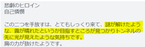この二つを手放すは、とてもしっくり来て、謎が解けたような、霧が晴れたというか目指すところが見つかりトンネルの先に光が見えたような気持ちです。